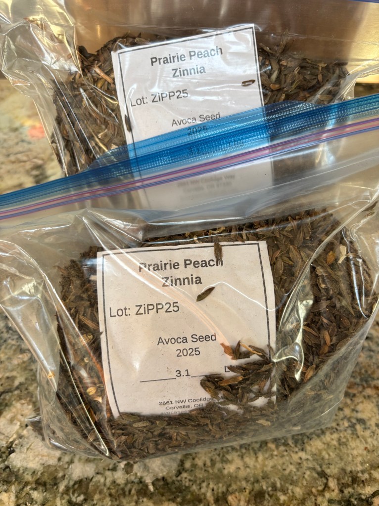 This story of Prairie Peach is only half of my breeding efforts. I have also been growing and crossing zinnias at my home. That breeding is more far-ranging in terms of crossing various zinnia varieties. But because it’s in town, where neighbors do grow zinnias, I have to bag and hand pollinate every flower I want to save. To my surprise, in 2025 I had several plants at home that are almost what I want in Prairie Rose.
